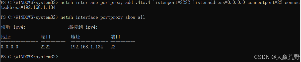 netsh interface portproxy add v4tov4 listenport=2222 listenaddress=0.0.0.0 connectport=22 connectaddress=192.168.1.134