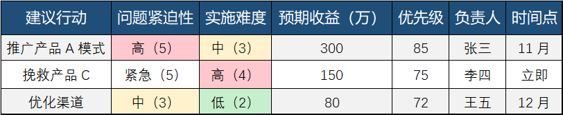 - 三个信息:产品A成功可复制、产品C急需挽救、新渠道有潜力