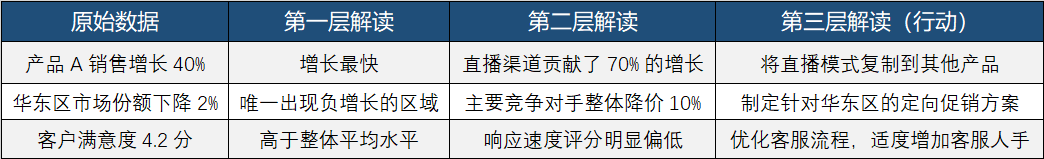 在每个数据点后,连续问三次"所以呢?",强迫自己深入思考: