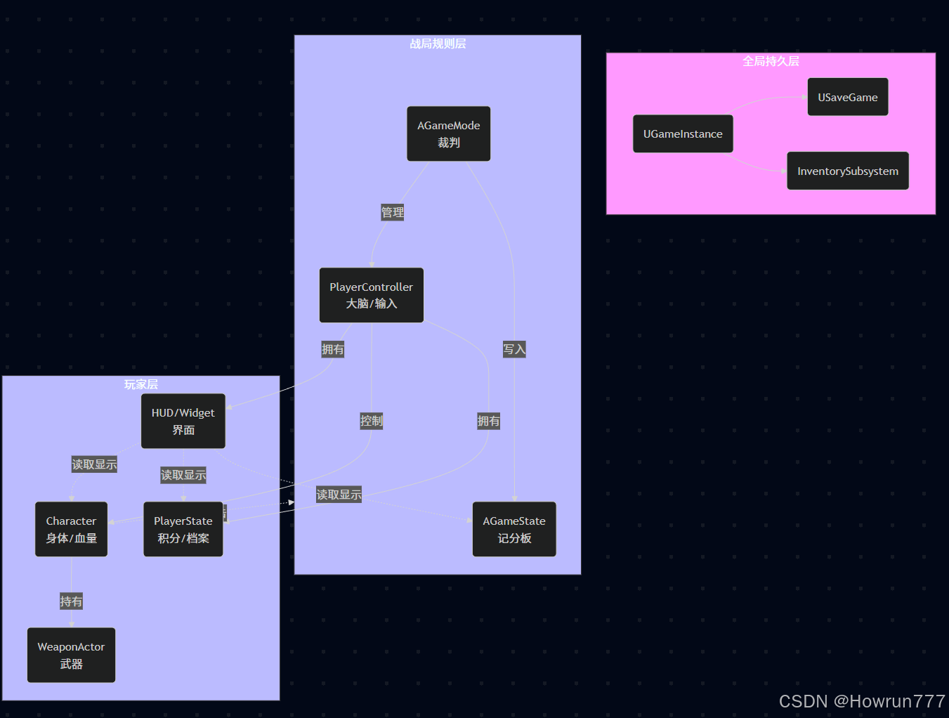 │ │ ├── APlayerController (玩家输入 / HUD / 摄像机管理)