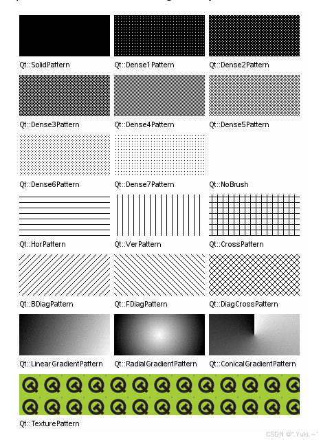 | QBrush | 画刷,定义填充样式(颜色、渐变、纹理) |
