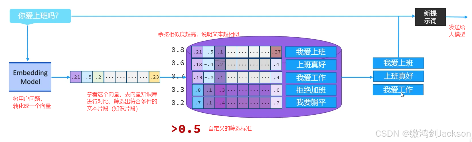 ③把满足要求(比如余弦相似度必须大于0.6)的向量拿出来,得到对应的文本片段(知识片段)