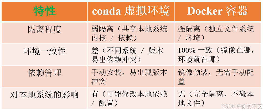 Docker是一个轻量级的环境隔离工具,可以把程序和它运行所需要的所有依赖打包成一个独立的镜像文件,然后在任何支持Docker的系统(WSL、Linux、Windows、Mac)上通过这个镜像创建容器来运行程序--容器里的环境是完全独立的,和你本地的系统、软件、虚拟环境没有任何关联。