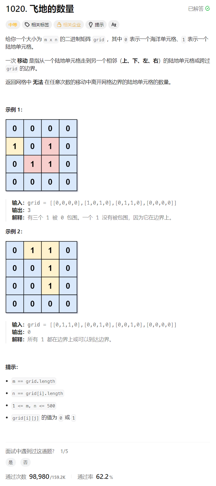思路:使用 BFS 算法先处理边界 1 ,再使用 BFS 统计陆地,体现正难则反的思想;