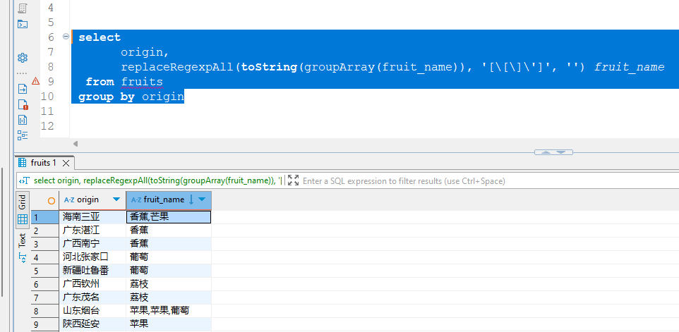 replaceRegexpAll(toString(groupArray(fruit_name)), '[\[\]\']', '') fruit_name