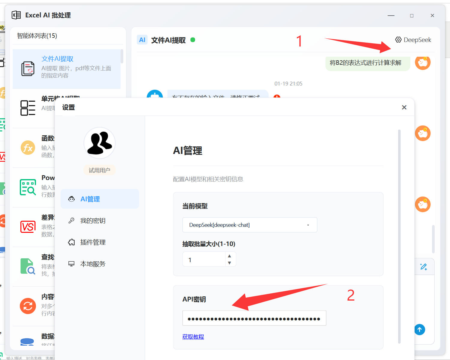 软件,默认是DeepSeek模型,需要在右上角设置模型的密钥。 也可以切换本地模型(可断网,但反应慢)等其它模型。