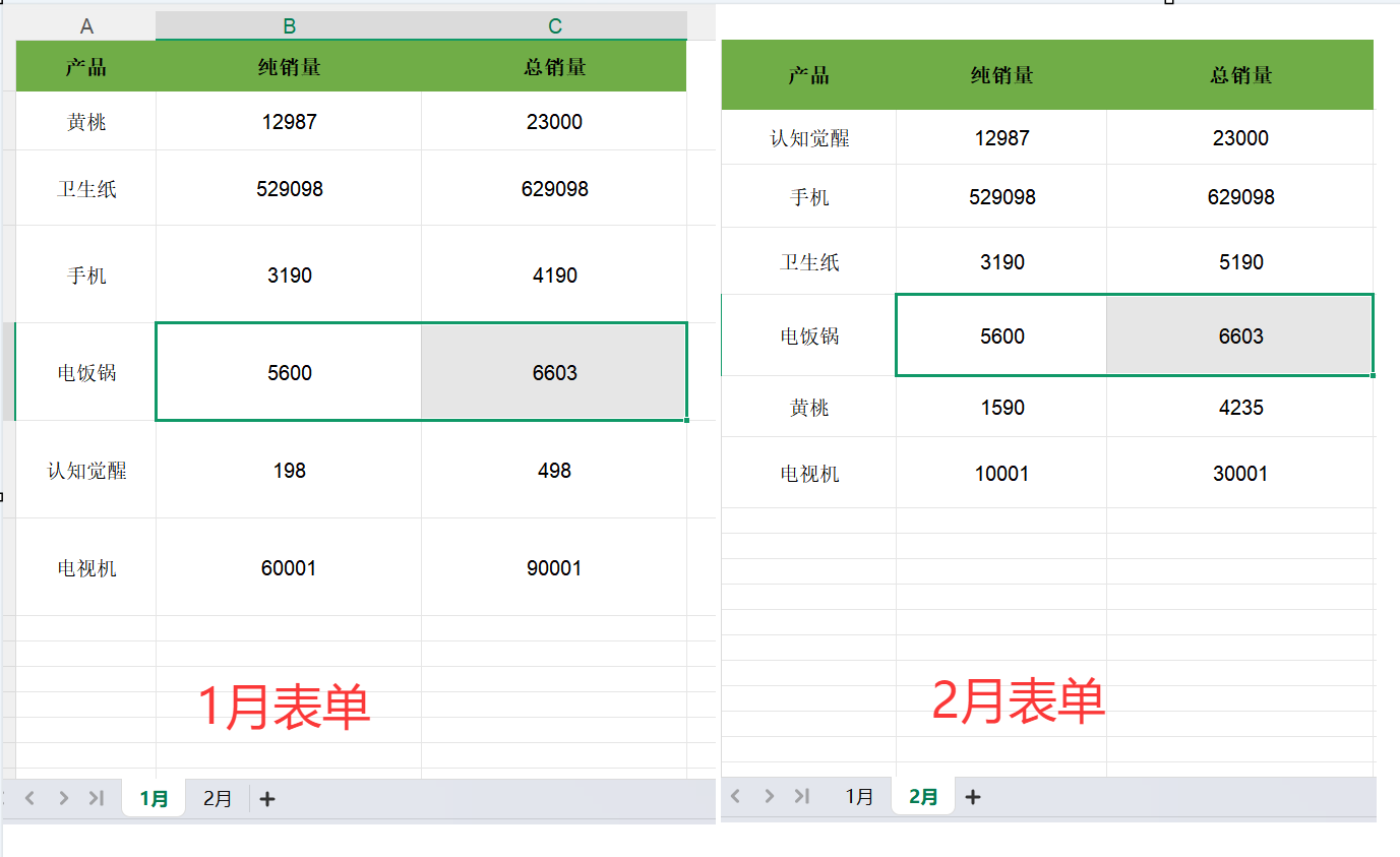 比如我有一个excel , 需要对比每个产品 1月份,2月份 的总销量,如果有不同的,需要提取这个产品,并且显示相差了多少。