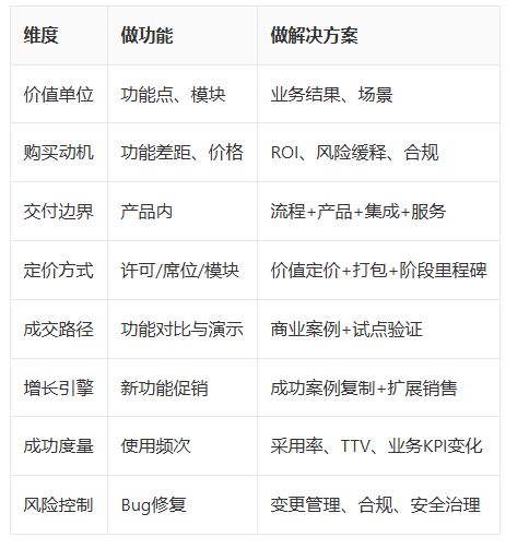 下表对比"做功能"与"做解决方案"在关键维度的差异,便于管理层统一语言并校准策略。