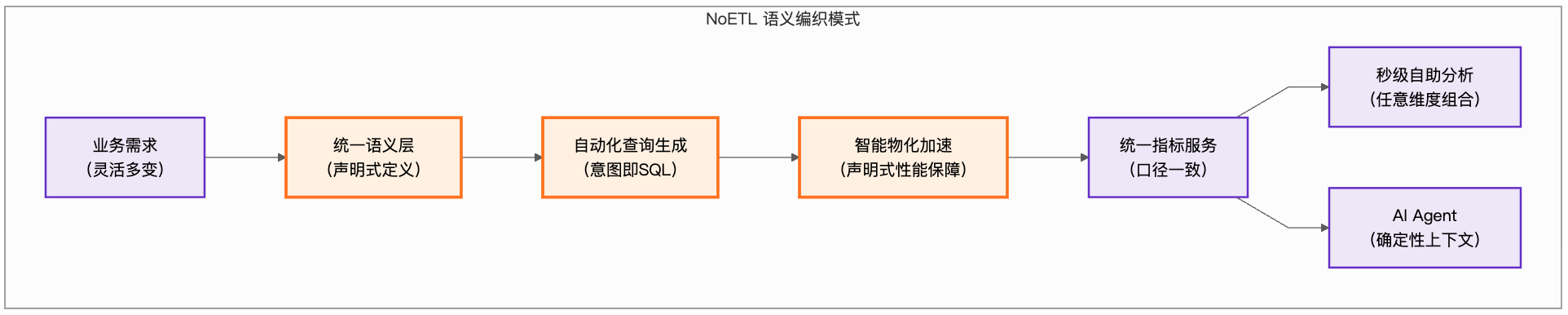 现代云数仓(如 Snowflake、BigQuery)解决了存储和计算的弹性问题,是强大的"引擎"。但业务灵活分析的需求,仍然需要通过人工开发大量宽表来满足,这导致了"最后一公里"的口径混乱和成本浪费。NoETL 语义编织是在这些强大引擎之上,构建统一、敏捷的"业务语义层"和"自动变速箱",让好引擎能持续、高效地产出可信、好用的数据。