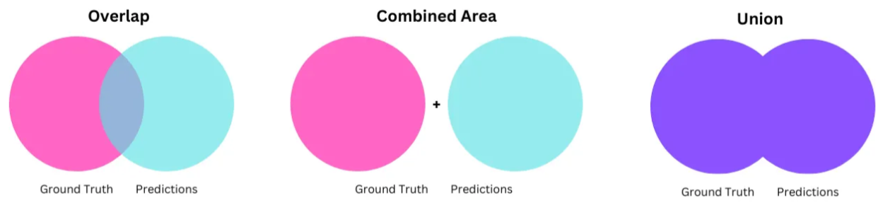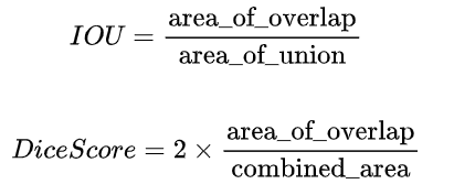 该函数计算预测掩码与真实标签掩码之间的两个核心指标------交并比(Intersection over Union, IOU)和 Dice 系数(Dice Score)。这些指标由以下公式表示: