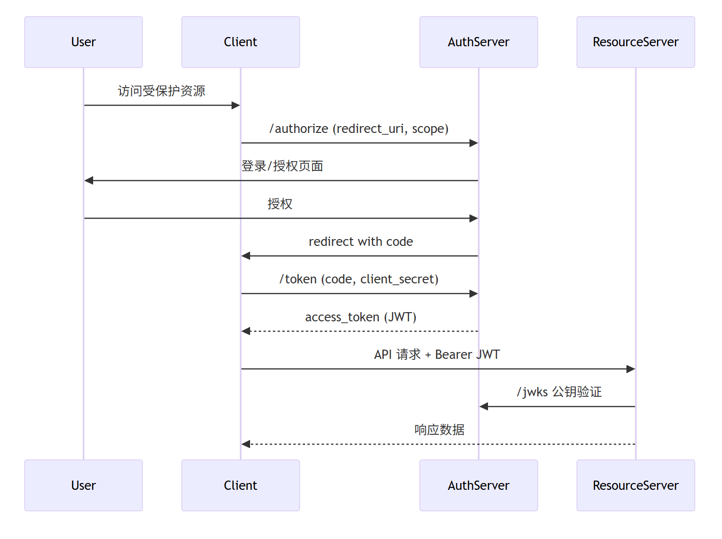 OAuth2 流程:Client → Auth Server (授权) → Token → Resource Server (验证)