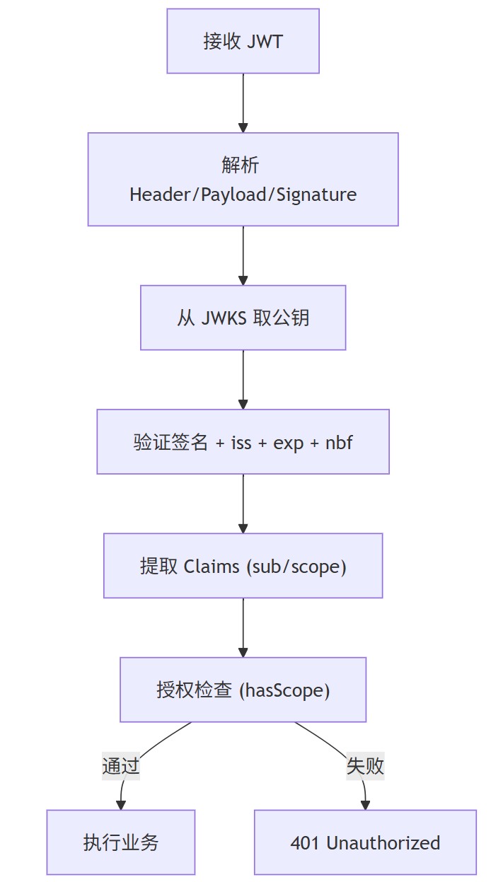 java// 简化版 JwtDecoder public Jwt decode(String token) { // 验证签名 + exp + iss return Jwt.withTokenValue(token).header("alg", "RS256").build(); } -
