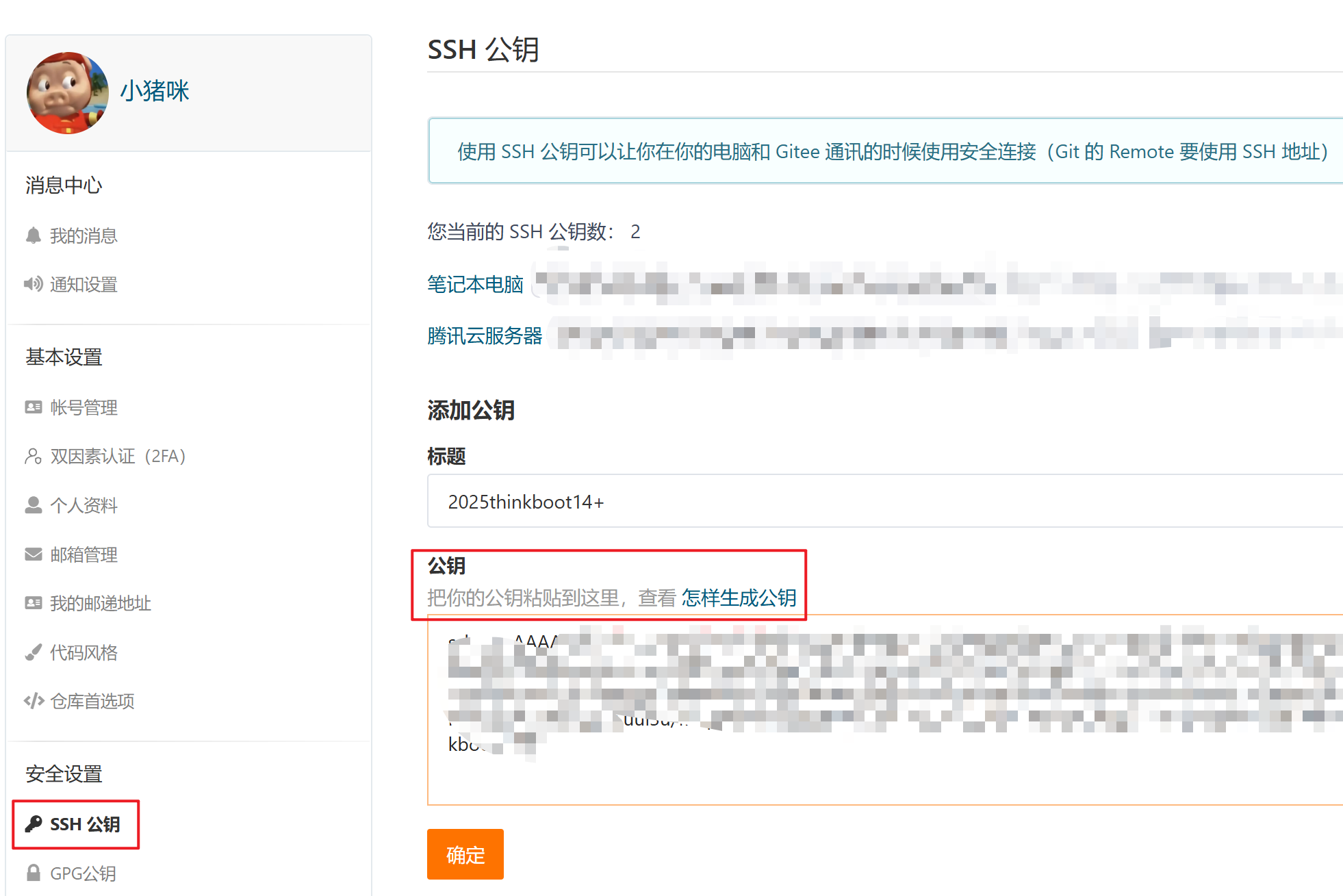 私钥不要泄露,公钥配置到远程仓库自己的账号里: