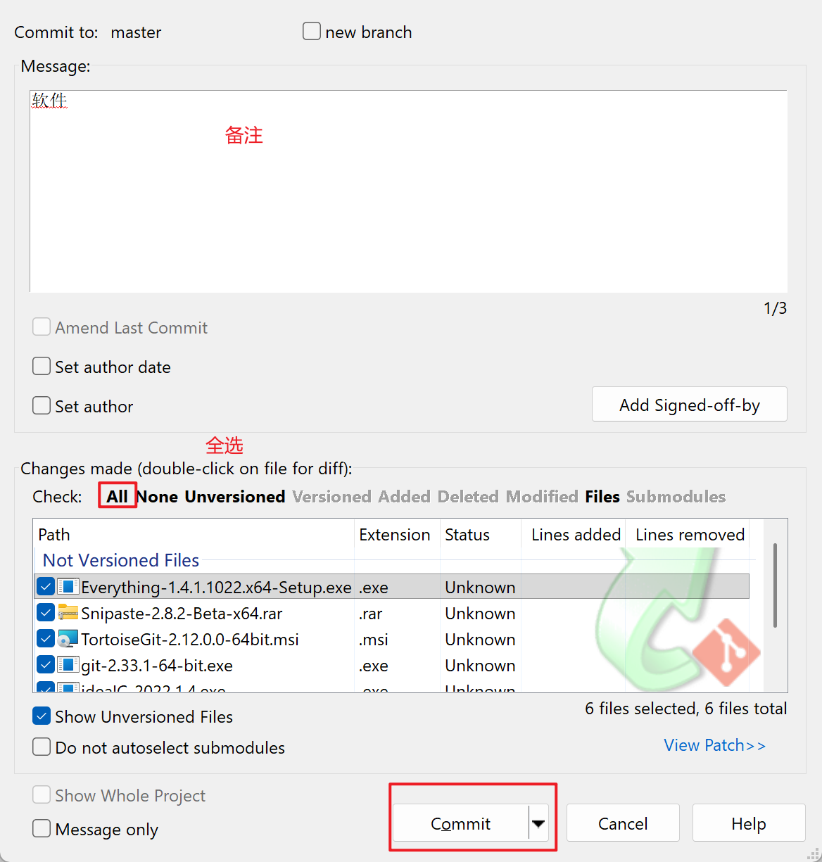 然后小乌龟(应该是先 add 的,但是 commit 直接自动 add 了)commit 把文件提交到本地仓库: