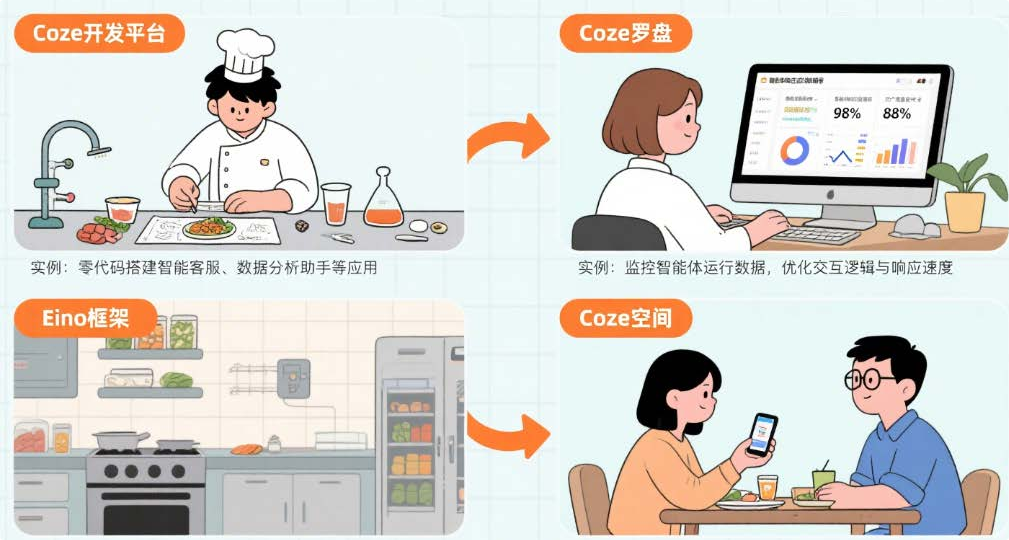 Eino框架:相当于餐厅的厨房基础设施,包括炉灶(核心引擎)、冷藏系统(数据存储)和排烟管道(数据流处理)。