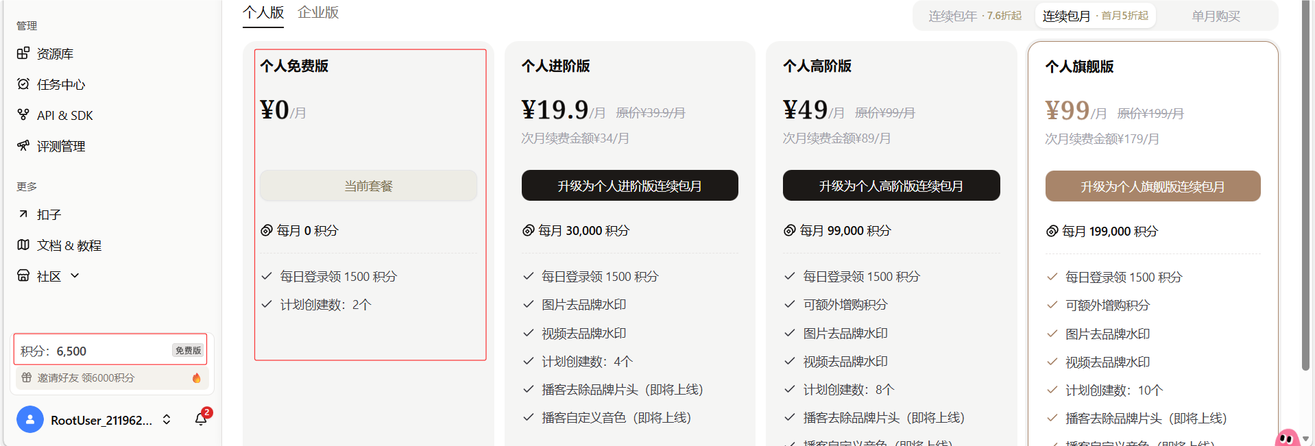 这个开发平台是付费制的,它先会给你一些积分,使用平台的功能会消耗这些积分,消耗完之后,就需要自己购买了。