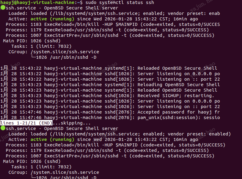 检查服务状态:sudo systemctl status ssh