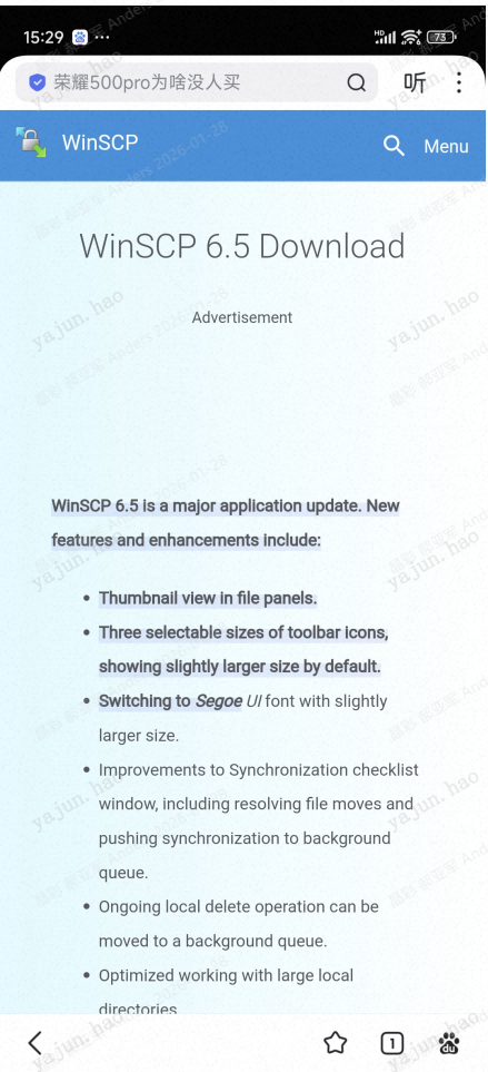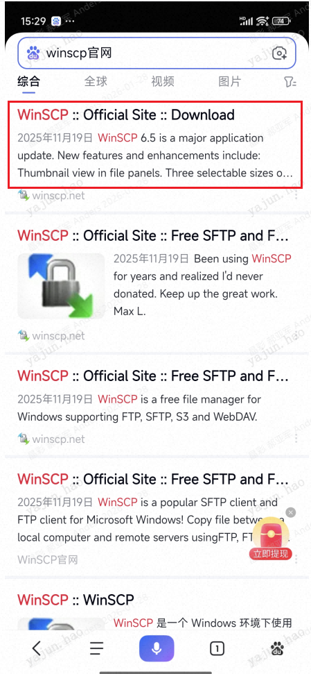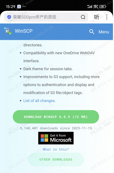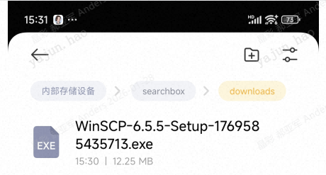 1、下载WinSCP-6.5.5-Setup.exe。因公司电脑网络安全限制,我用手机下载该软件。