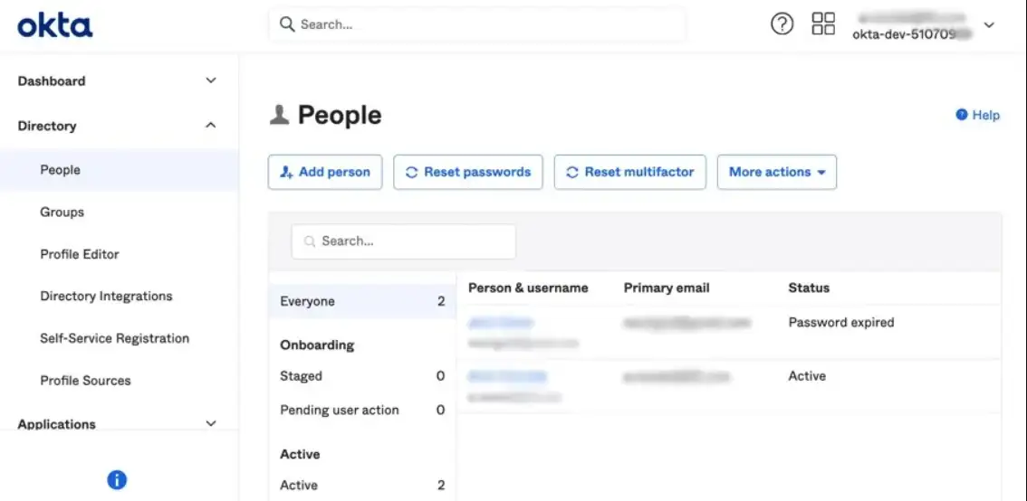在大多数情况下,企业的多个用户都需要访问应用。在 Okta 管理员控制台目录(Directory)类别下的人员(People)页面上添加每个用户。