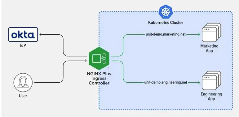 您可以通过集成 Okta 与其他应用、定义其他 OIDC 策略并在 VirtualServer 资源中引用这些策略来实现这一点。在下图描述的示例中,有两个子域名:unit-demo.marketing.net 和 unit-demo.engineering.net,它们解析为 NGINX Ingress Controller 的外部 IP 地址。