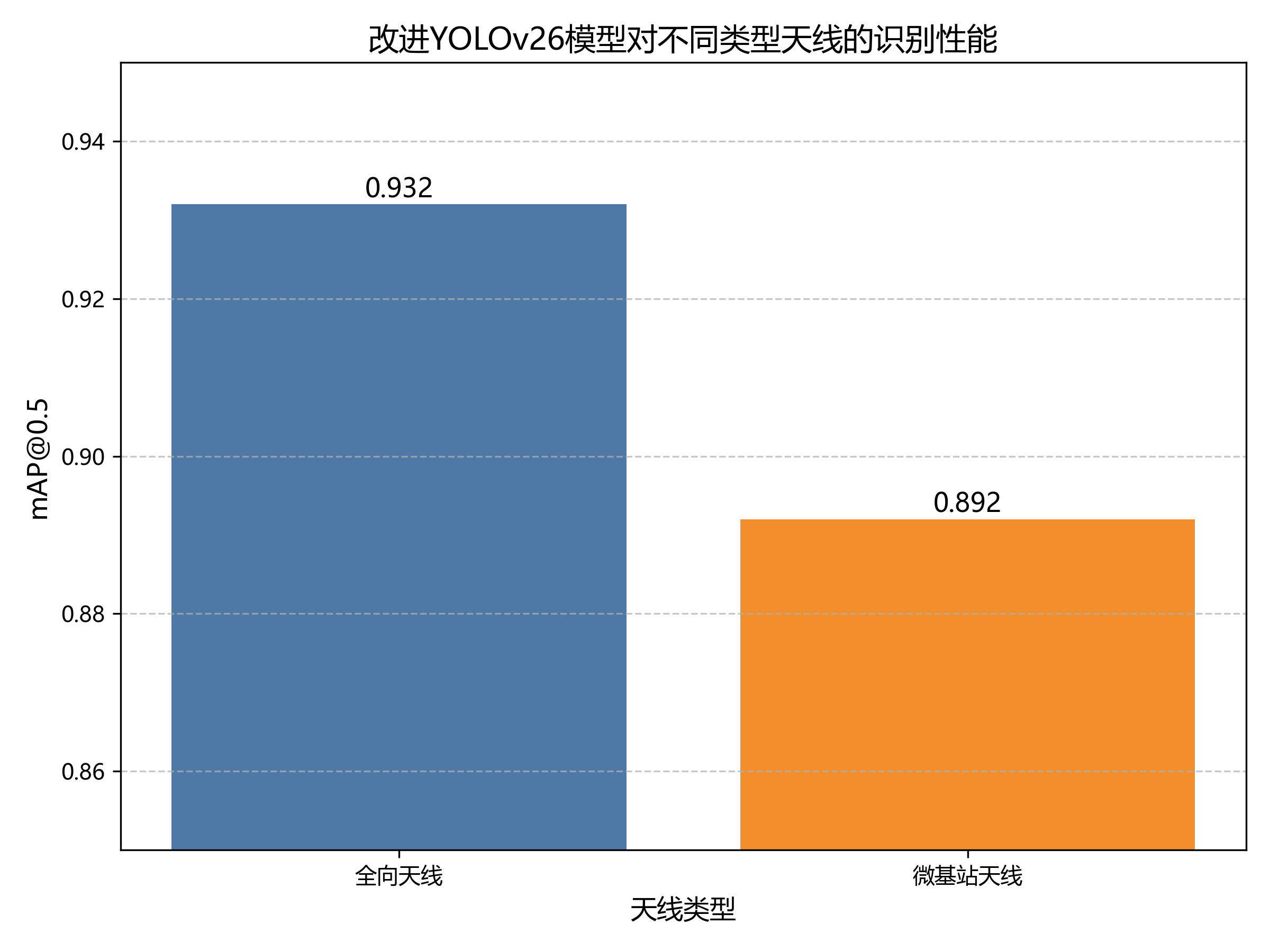 从表2可以看出,改进YOLOv26模型对所有类型的天线都具有较好的识别性能,其中对全向天线的识别性能最好,mAP@0.5达到了0.932,而对微基站天线的识别性能相对较低,但也达到了0.892。这主要是因为全向天线具有较为明显的视觉特征,而微基站天线尺寸较小,且在不同环境下的视觉变化较大,增加了识别难度。