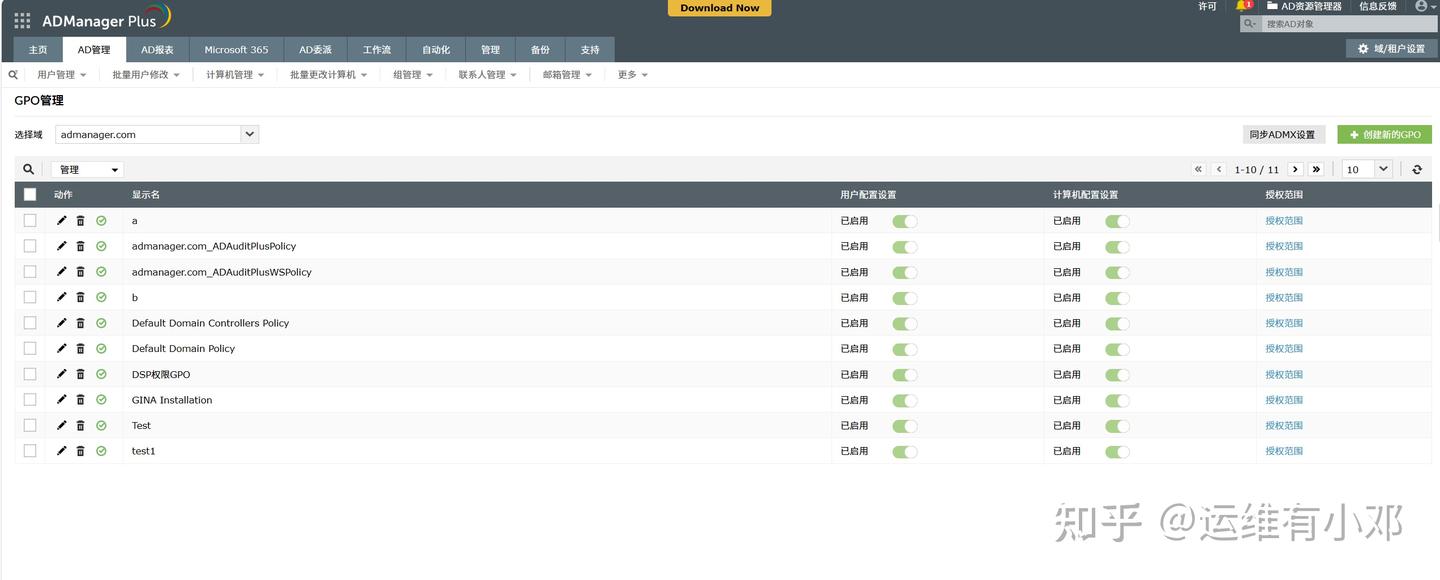 可生成涵盖用户权限分配、组成员变更、登录日志等维度的全面报表,支持自定义报表字段与统计周期。这不仅为IT团队开展持续监控提供精准数据支撑,还能提供清晰可追溯的访问控制活动审计轨迹,助力企业顺利通过HIPAA、GDPR等各类合规认证核查。组策略管理:提供集中化的组策略对象(GPO)管理界面,支持批量创建、修改、部署与备份GPO,可快速将统一的安全策略与访问规则推送至全企业终端。无需依赖复杂的原生配置工具与人工操作,有效避免策略不一致问题,提升管理效率与安全性。