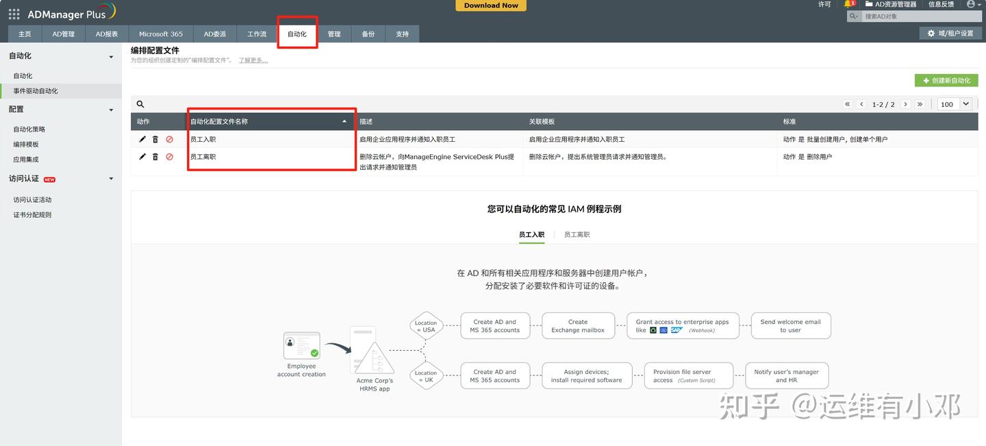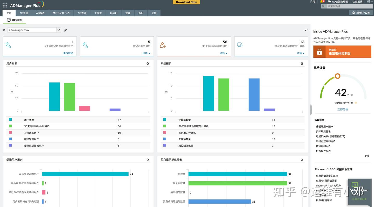 ManageEngine ADManager Plus 是一款针对活动目录(Active Directory)管理和 Microsoft 365 的全面 IAM 解决方案,可帮助执行最小权限原则、自动化重复性任务,并维持完整的审计轨迹以满足法规标准。其部分功能包括: