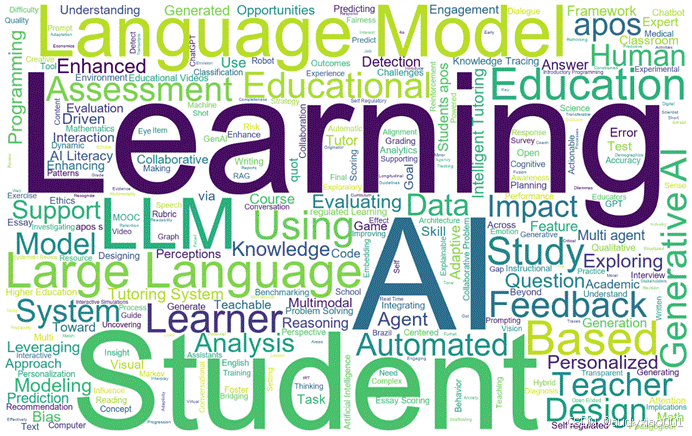 在全面统计AIED 2025全部论文标题并生成词云后,可以清晰看到今年人工智能教育领域的研究热点与整体趋势。如图2所示,本届会议的关键词呈现出高度聚类特征,其中"learning"、"AI"、"language"、"model"、"student"等词在所有标题中频繁出现,构成了AIED研究的核心语义结构。这一结果不仅反映了学习科学在AIED领域的长期主导地位,也展现了大语言模型、多模态学习分析、自动化内容生成、学习者建模以及教育公平与伦理等方向的快速发展。