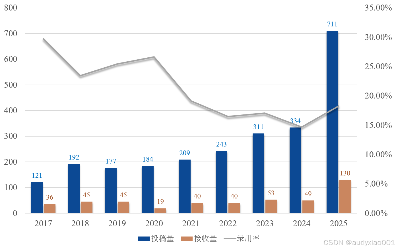 从录用率趋势来看,AIED在2017--2025年间整体呈下降趋势:2017年录用率约为29.8%,到2025年降至约18.3%。尤其在2017--2022年间下降显著,从接近30%逐步降到16--19%区间,反映了竞争日趋激烈。尽管2025年投稿量大幅增加,但录用率仍维持在18.3%,说明会议在扩展规模的同时仍然坚持高标准录用政策。