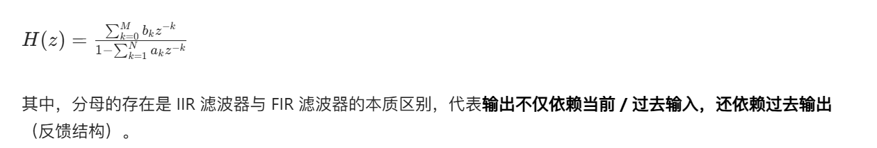 - IIR 滤波器的核心是反馈结构,单位冲激响应无限长,系统函数为有理分式;