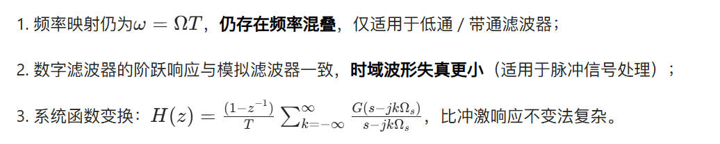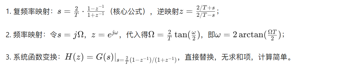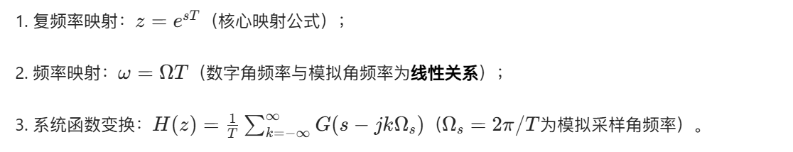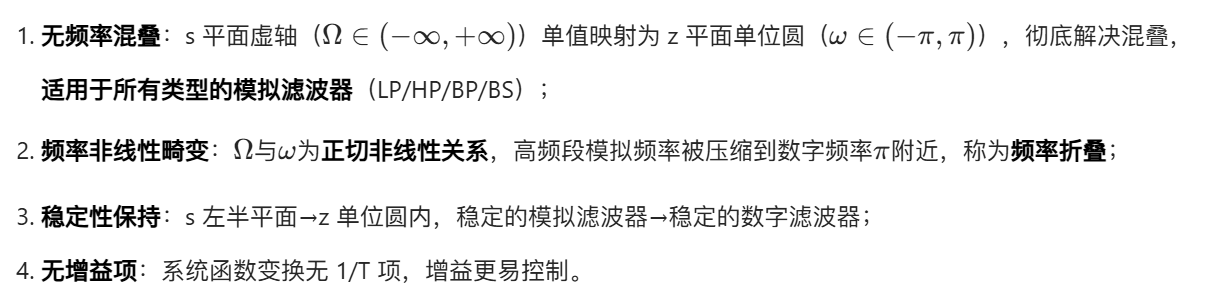 - 模拟→数字的主流映射方法为冲激响应不变法 (线性频率,有混叠)和双线性变换法(无混叠,需预畸变);