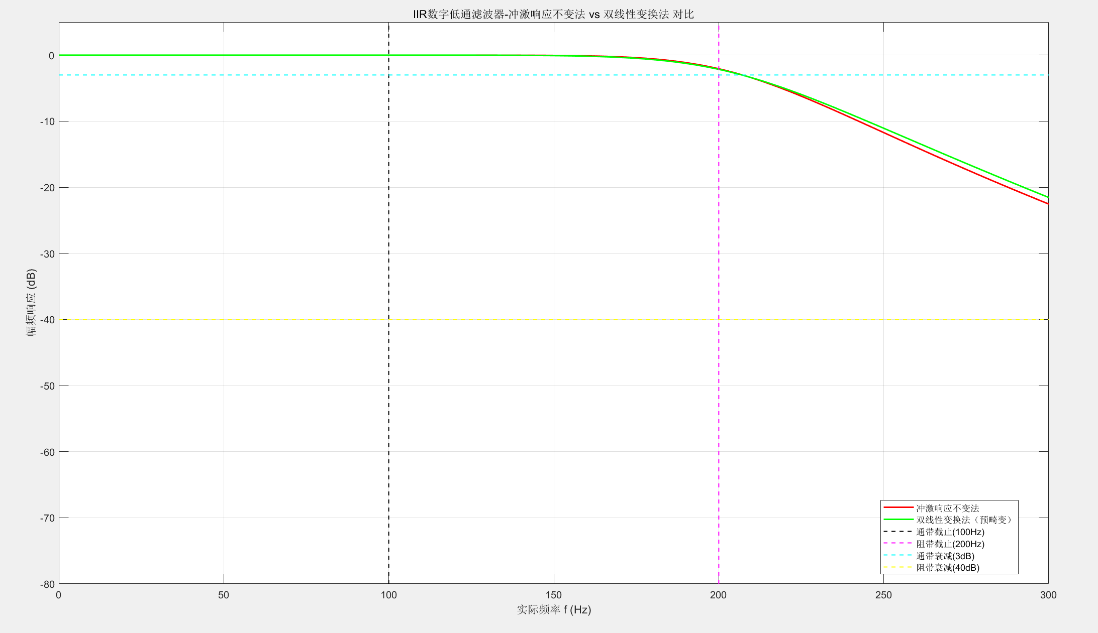 - 设计数字低通 IIR 滤波器,指标:fs=800Hz,fp=100Hz,αp≤1dB,fs=200Hz,αs≥60dB,分别用冲激响应不变法和双线性变换法设计,绘制幅频特性对比图,并验证指标是否满足。