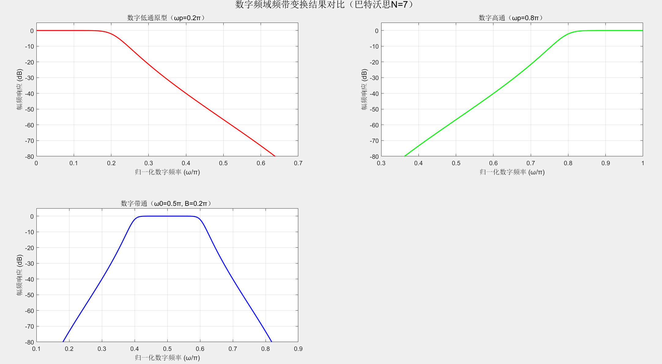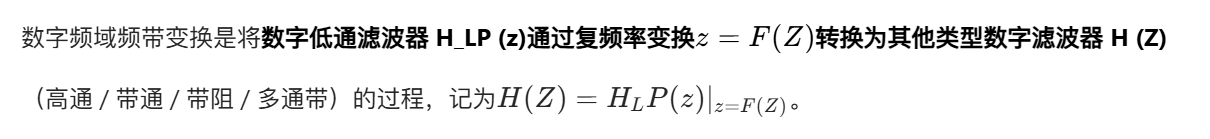 MATLAB 提供了数字频带变换的专用函数 ,可直接将数字低通转换为其他类型数字滤波器,核心函数为lp2lp/lp2hp/lp2bp/lp2bs(数字版),函数格式: