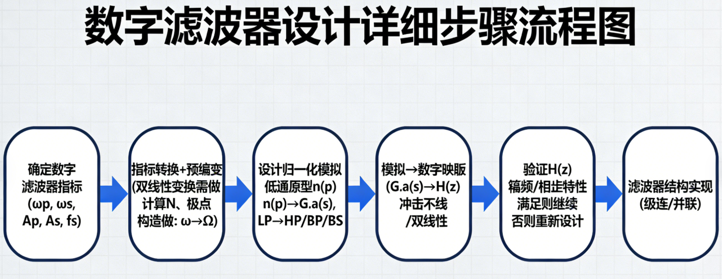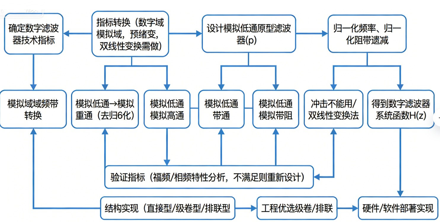 IIR 数字滤波器的设计并非单一步骤,而是从指标分析到最终实现的完整流程 ,经典间接法的通用实现步骤为标准化流程,可直接指导工程实践,流程图如下: