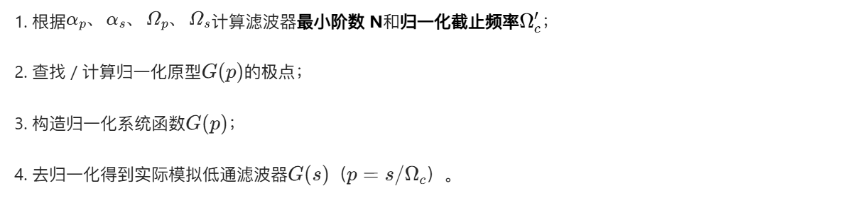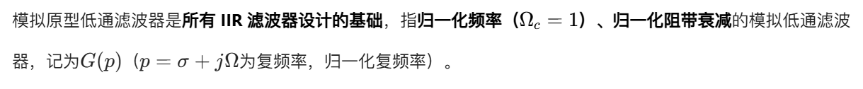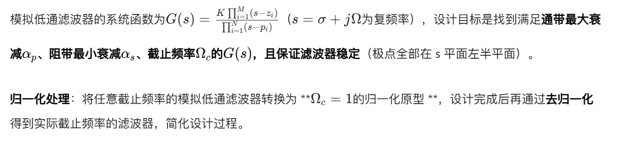 - 原型设计:模拟低通原型为基础,所有其他类型滤波器均由其变换得到;