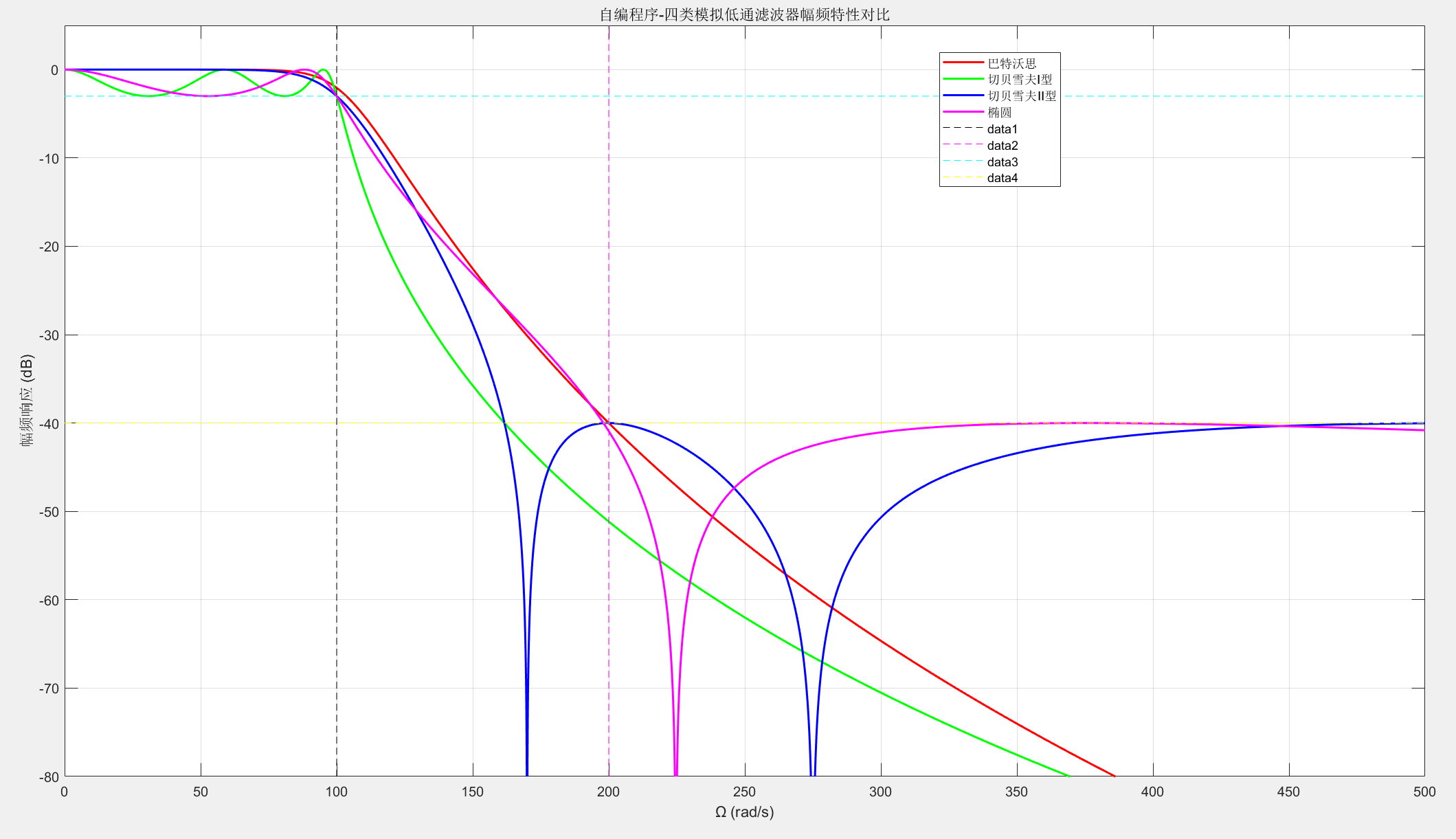 经典的模拟低通原型滤波器有五类 ,各有优劣,适用于不同工程场景,其中巴特沃思 和切贝雪夫为最常用的两类,椭圆和贝塞尔为特殊场景选用。