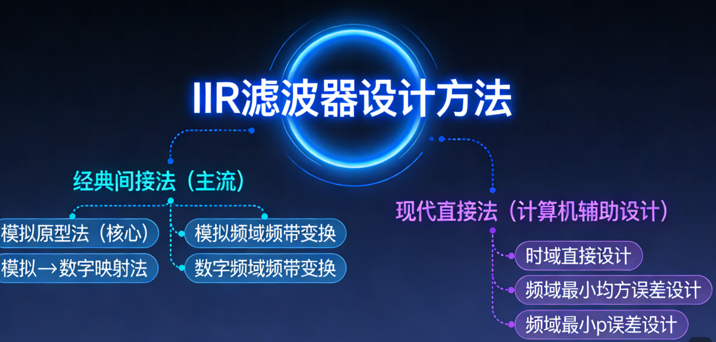 - 设计方法:以模拟滤波器设计为基础 (模拟滤波器理论成熟),通过 "模拟→数字" 的映射实现,即间接法(主流),也可直接在数字域设计(计算机辅助设计法)。