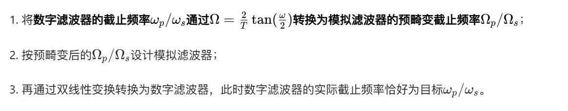 双线性变换法设计前需频率预畸变,将数字频率转换为模拟频率Ω=(2/T)tan(ω/2)。