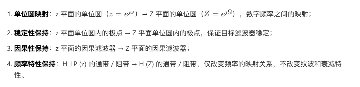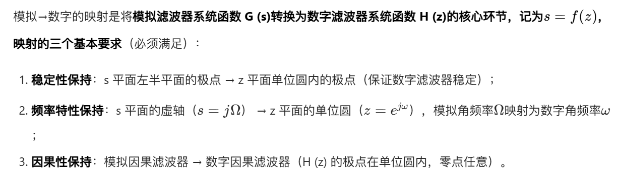 - 模拟→数字映射的三个基本要求是什么?冲激响应不变法和双线性变换法的核心优缺点及适用场景分别是什么?