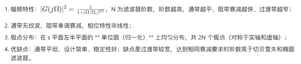 巴特沃思(Butterworth)滤波器 的核心特点是通带幅频特性最平坦,无纹波,阻带单调衰减,又称为 "最平幅度滤波器"。
