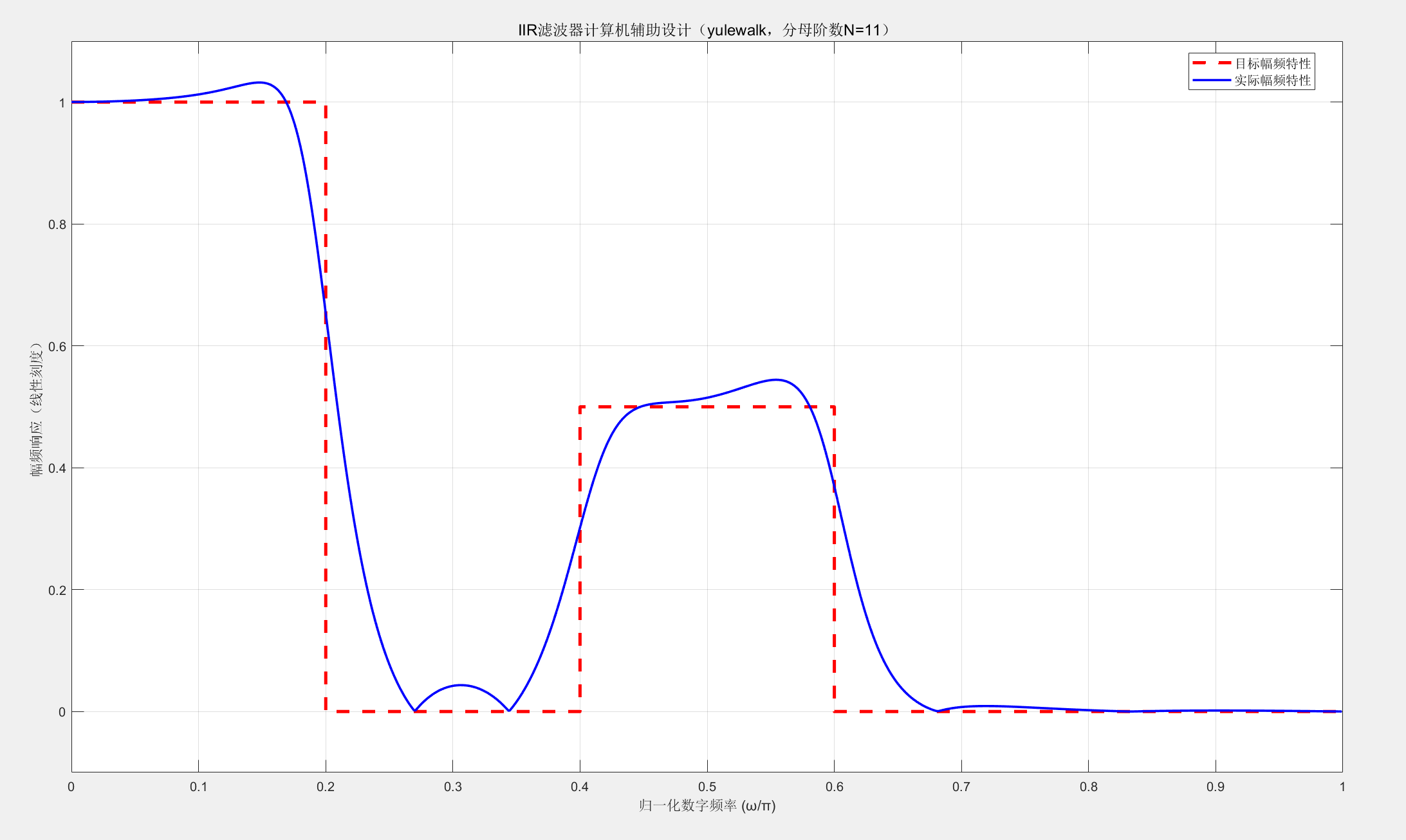 yulewalk函数设计一个数字多通带 IIR 滤波器,目标幅频特性:0~0.1π(1)、0.1π~0.3π(0)、0.3π~0.5π(0.8)、0.5π~0.7π(0)、0.7π~π(0.5),选择合适的阶数,绘制目标与实际幅频特性对比图。 - 简述五类模拟低通滤波器的性能差异,结合工程场景说明如何选择合适的滤波器类型。