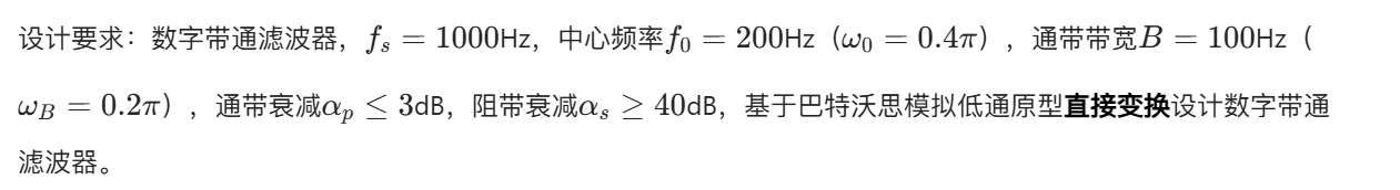 - 基于巴特沃思模拟低通原型,通过第一种设计方案设计数字带通滤波器,指标:fs=1000Hz,中心频率f0=250Hz,带宽B=50Hz,αp≤3dB,αs≥40dB,给出完整设计步骤和 MATLAB 代码。