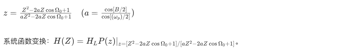 参数说明:bz,az为数字低通原型系数;Wo为目标中心频率 / 截止频率(归一化,0~1);Bw为目标带宽(归一化)。