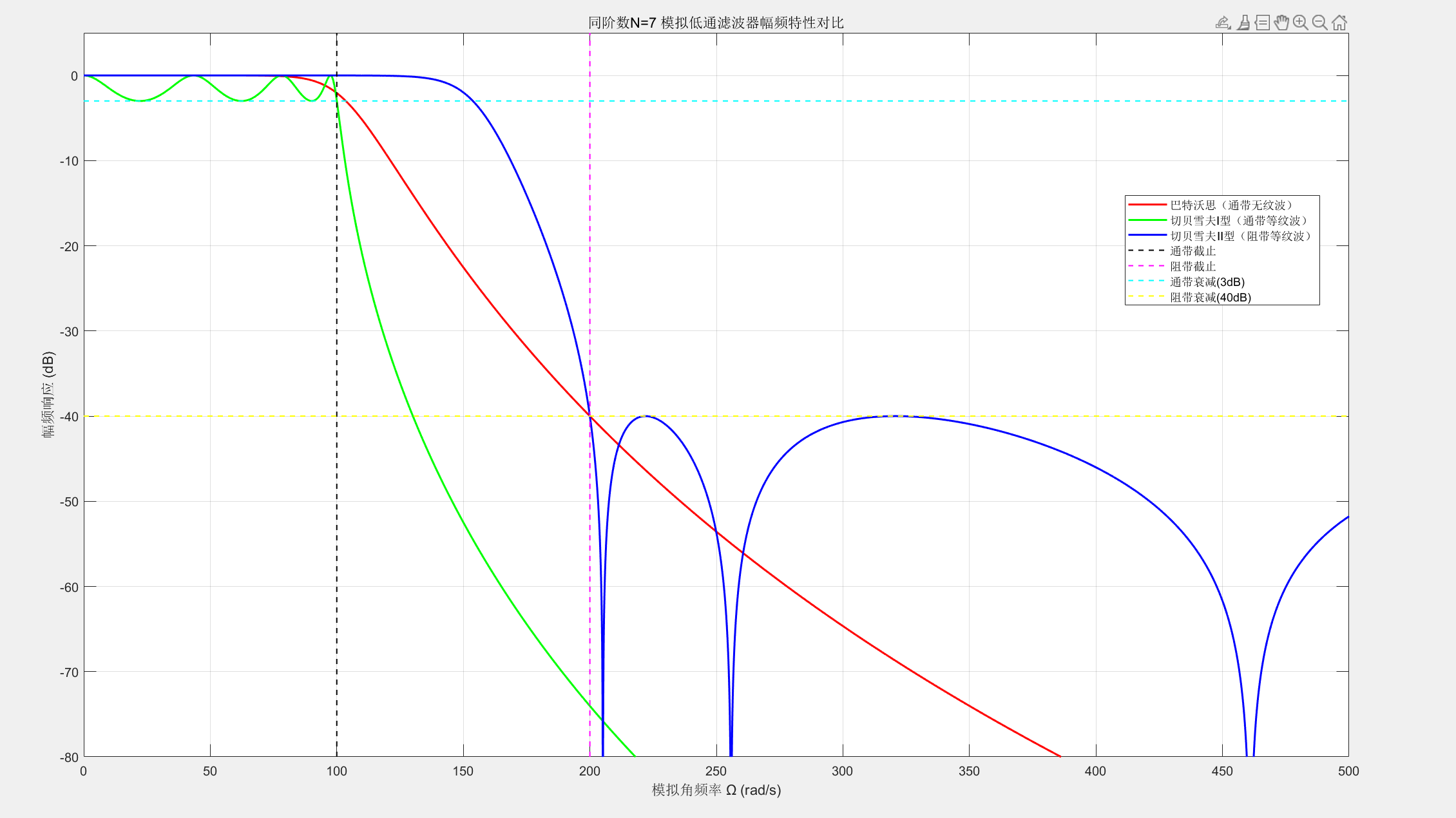 设计要求:同 7.5.2,对比同阶数巴特沃思、切贝雪夫 Ⅰ 型、切贝雪夫 Ⅱ 型的幅频特性,直观体现纹波和过渡带差异。