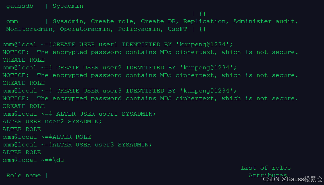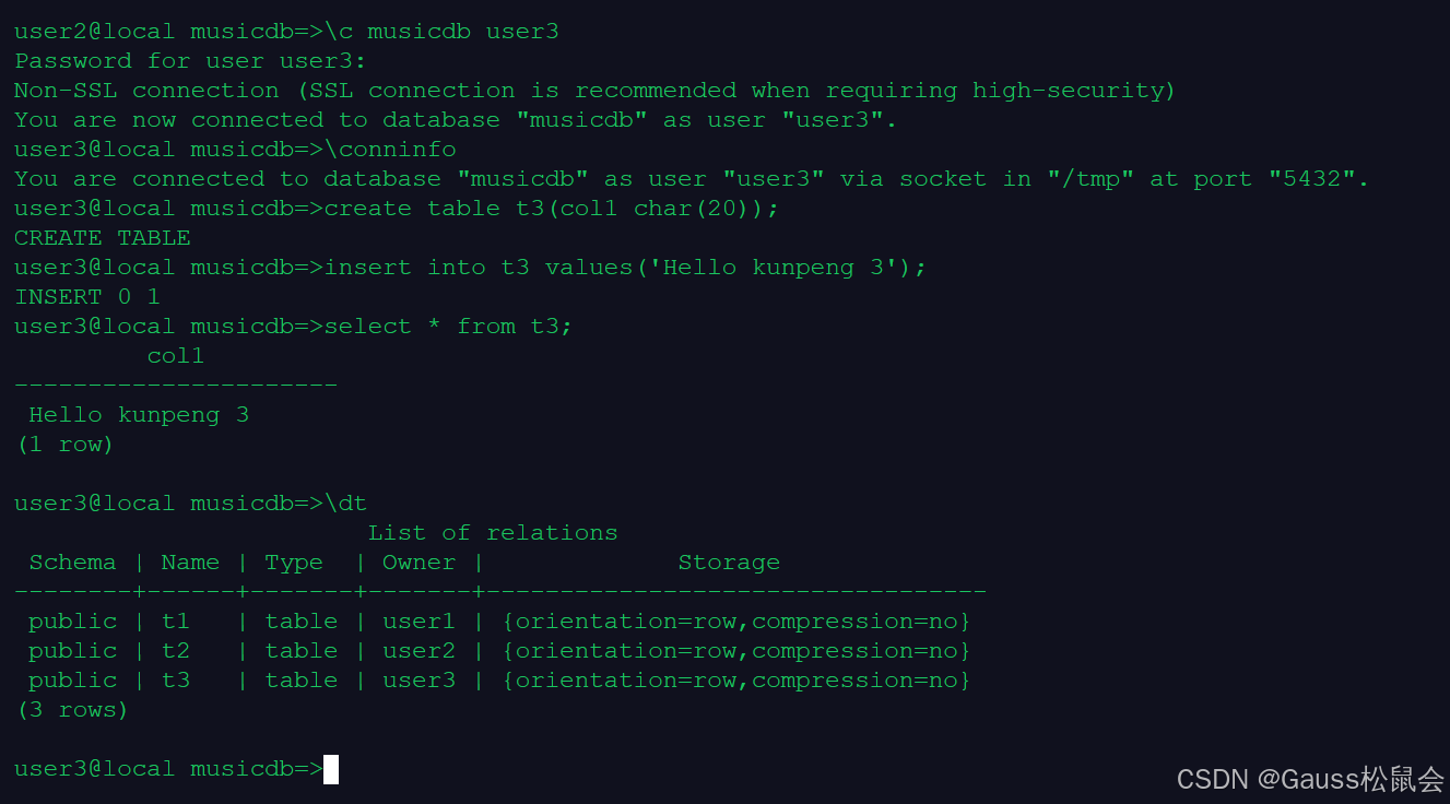 CREATE USER user3 IDENTIFIED BY 'kunpeng@1234';