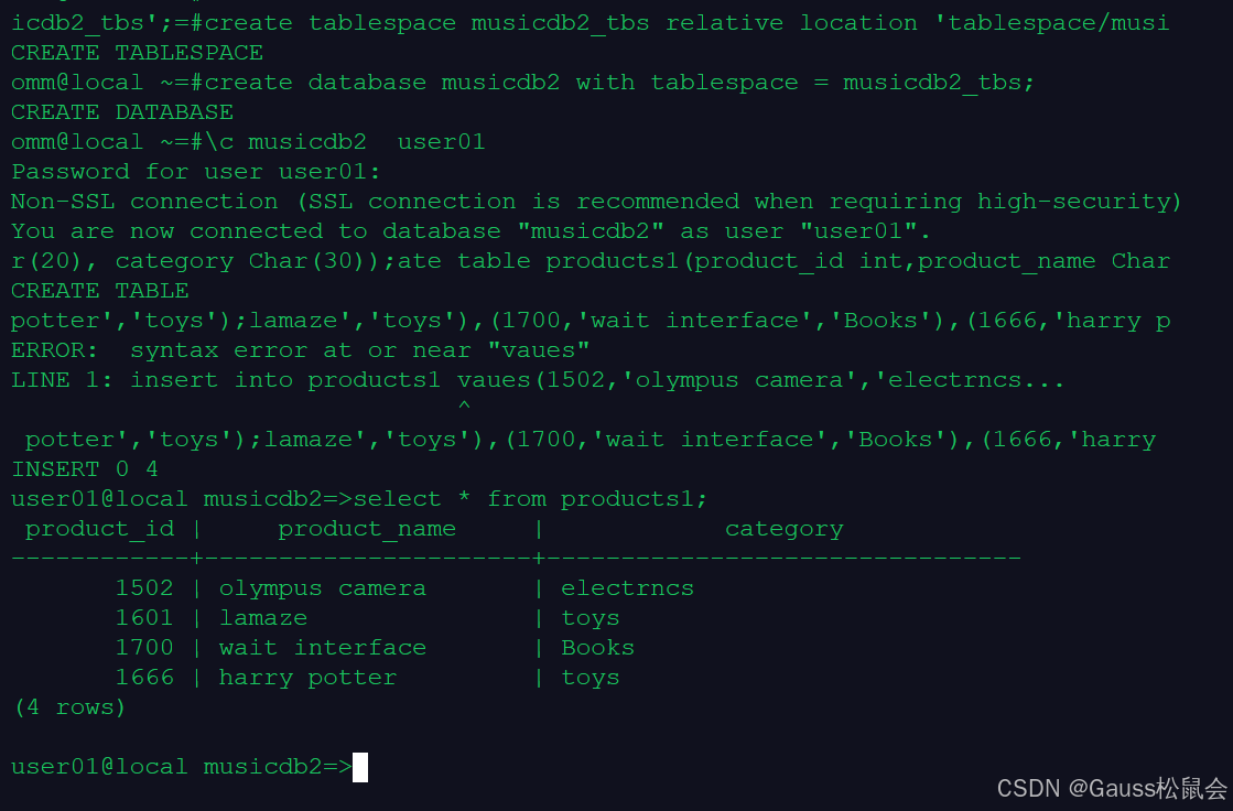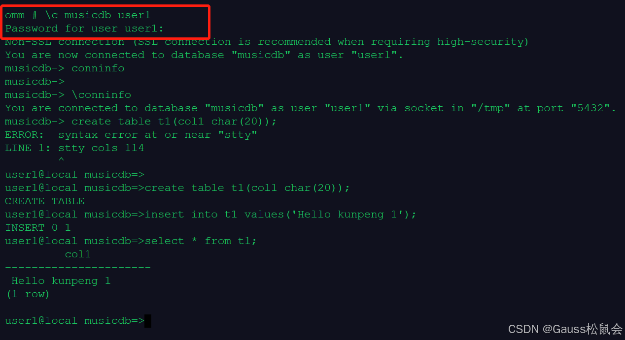 --以用户 user1 的身份在数据库 musicdb 中创建表 t1,并插入一条数据: