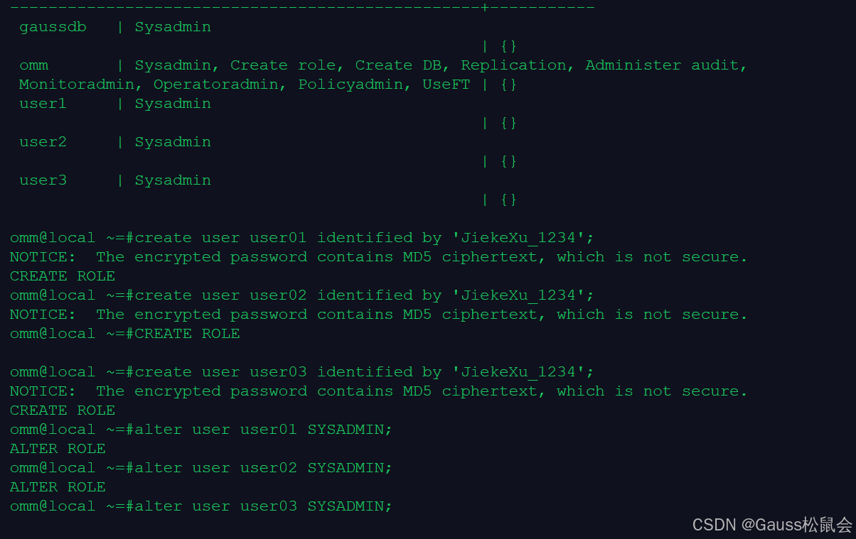 1.创建用户 user01、user02、user03,授予 user01、user02、user03 数据库系统的 SYSADMIN 权限