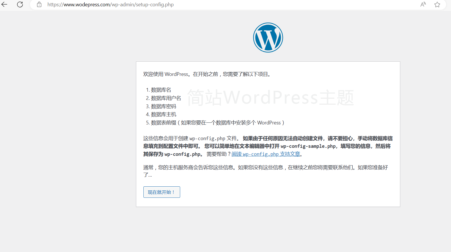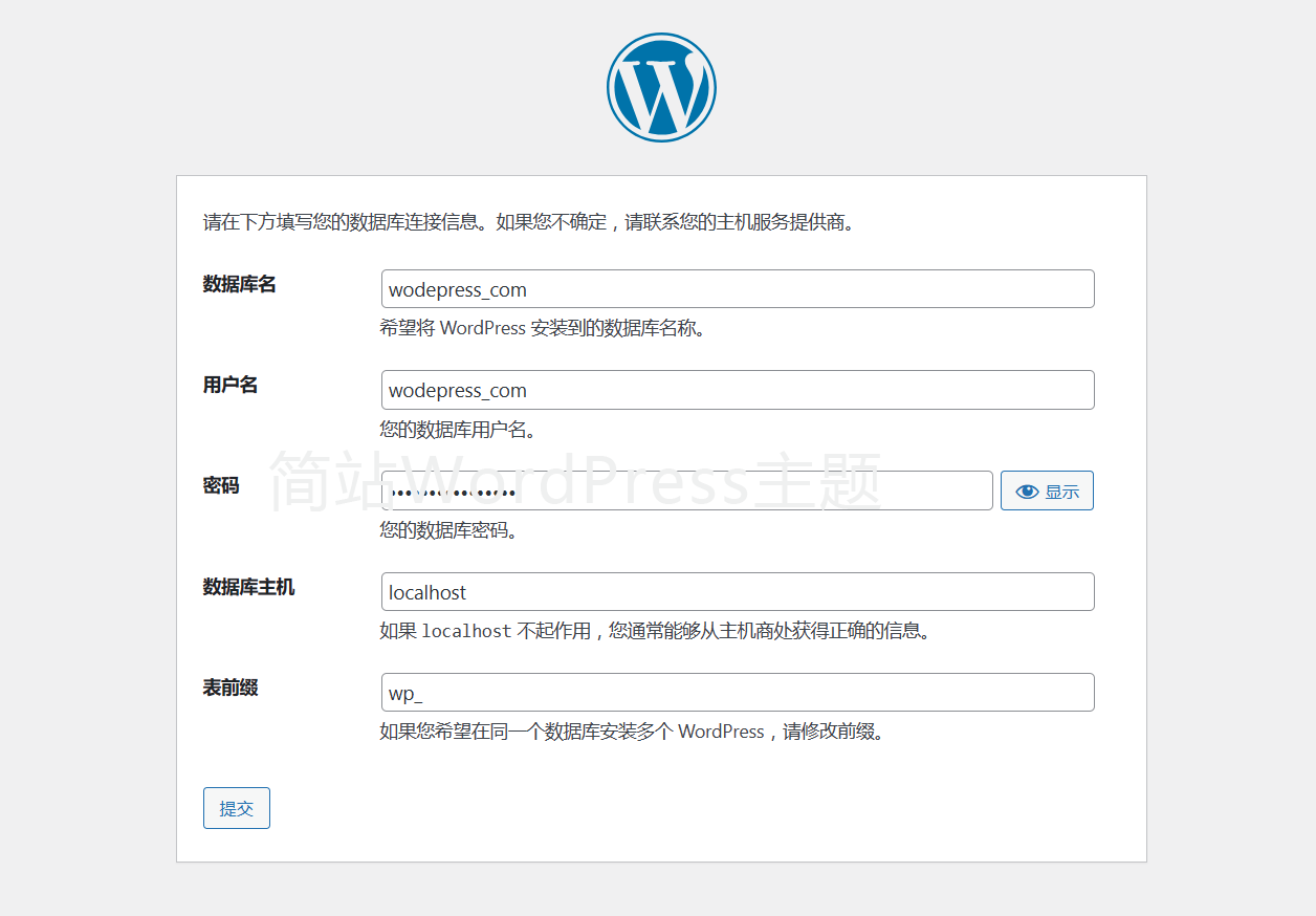 输入网站域名 www.wodepress.com 会出现如图所显的安装界面