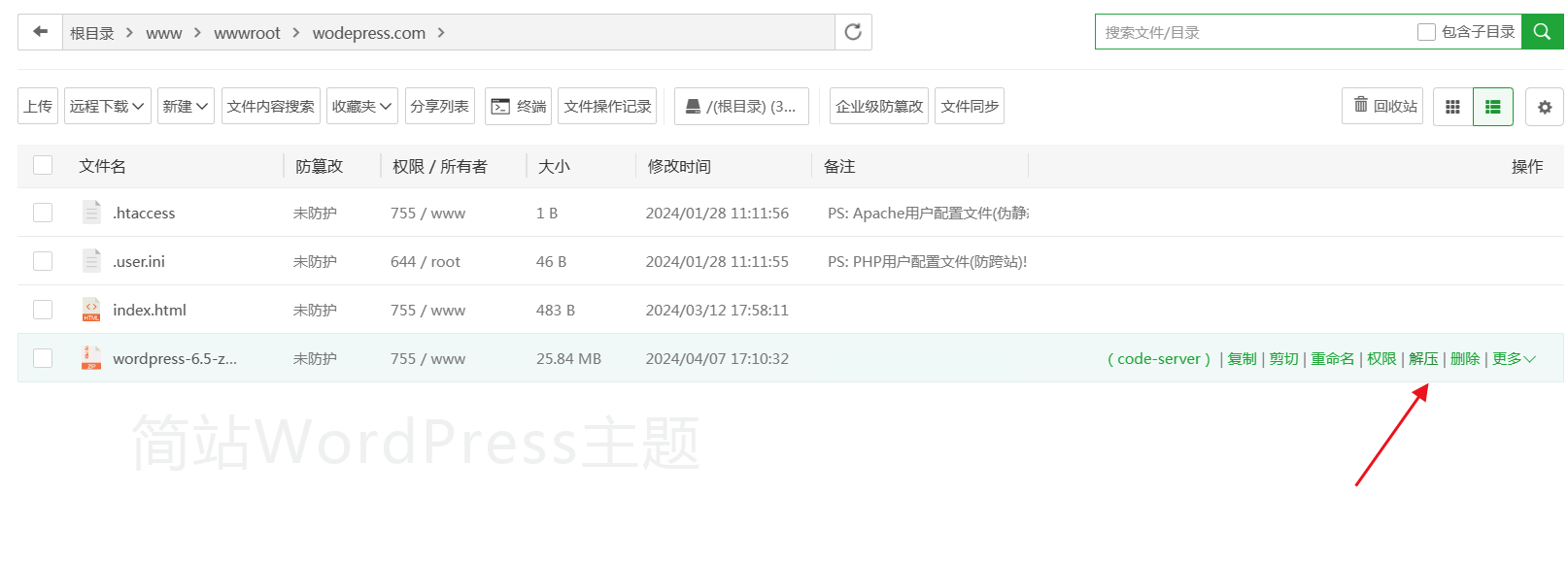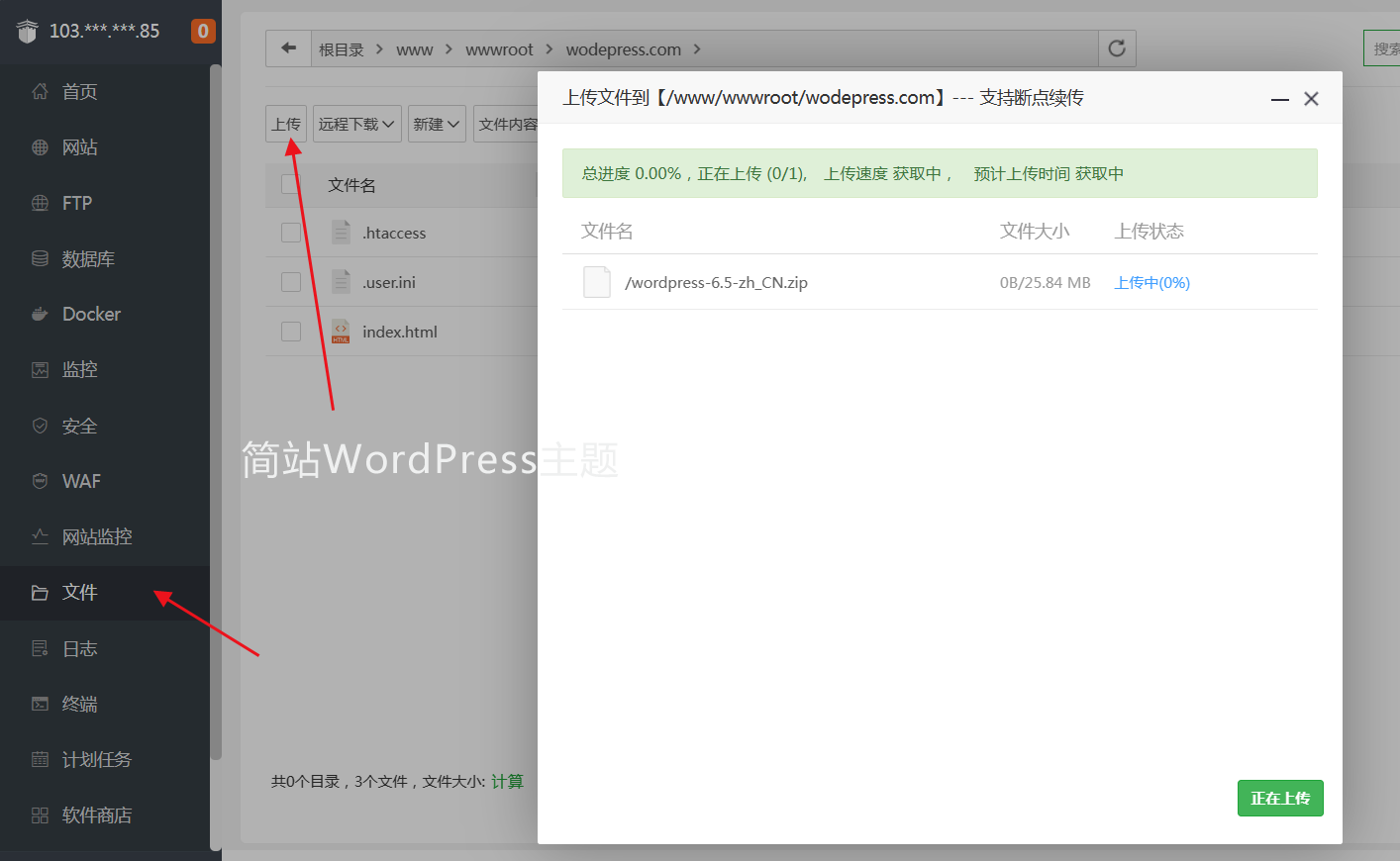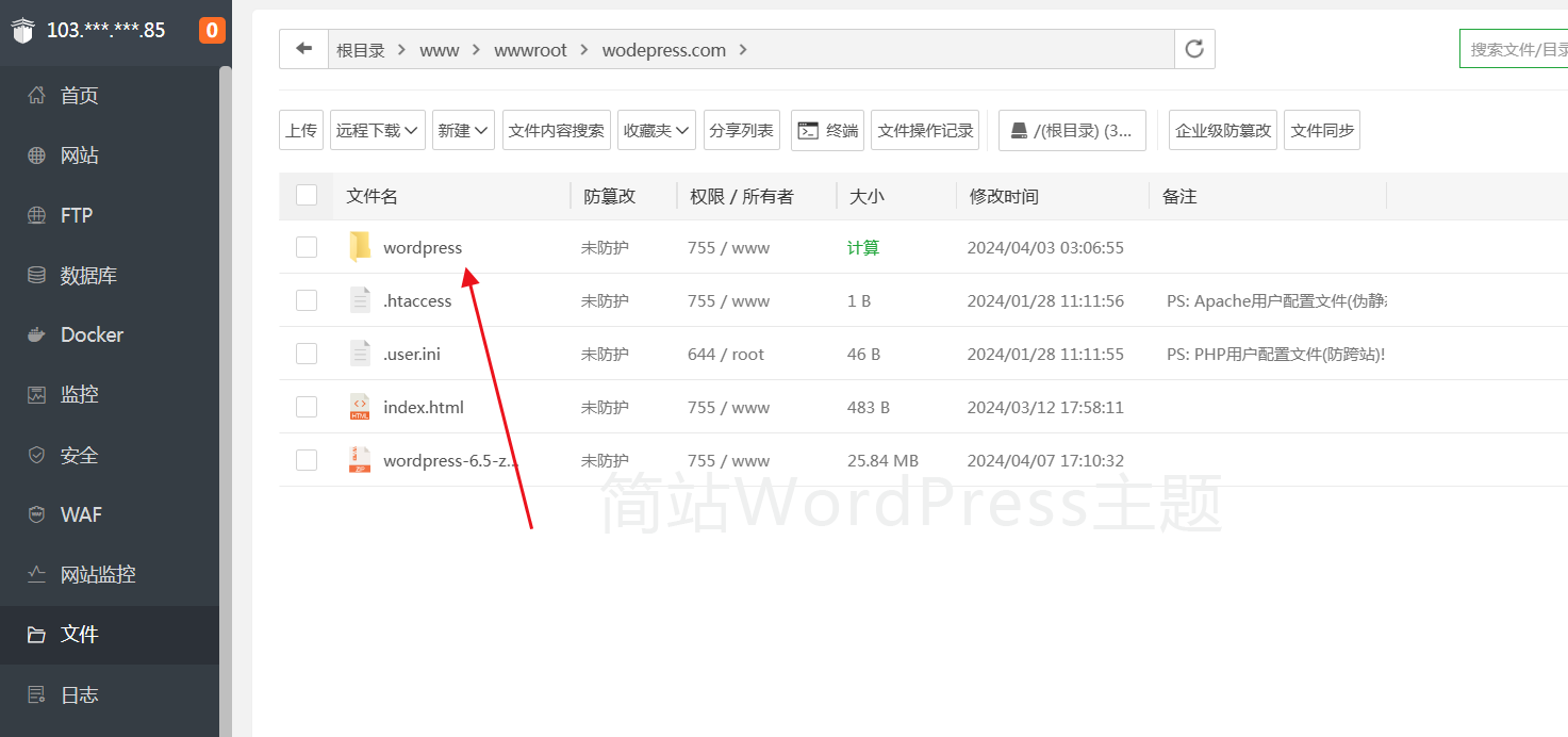 下载完成后在宝塔面板中找到"文件",选择"wodepress.com"文件夹,打开文件夹后,将下载好的 WordPress 程序上传到该目录。