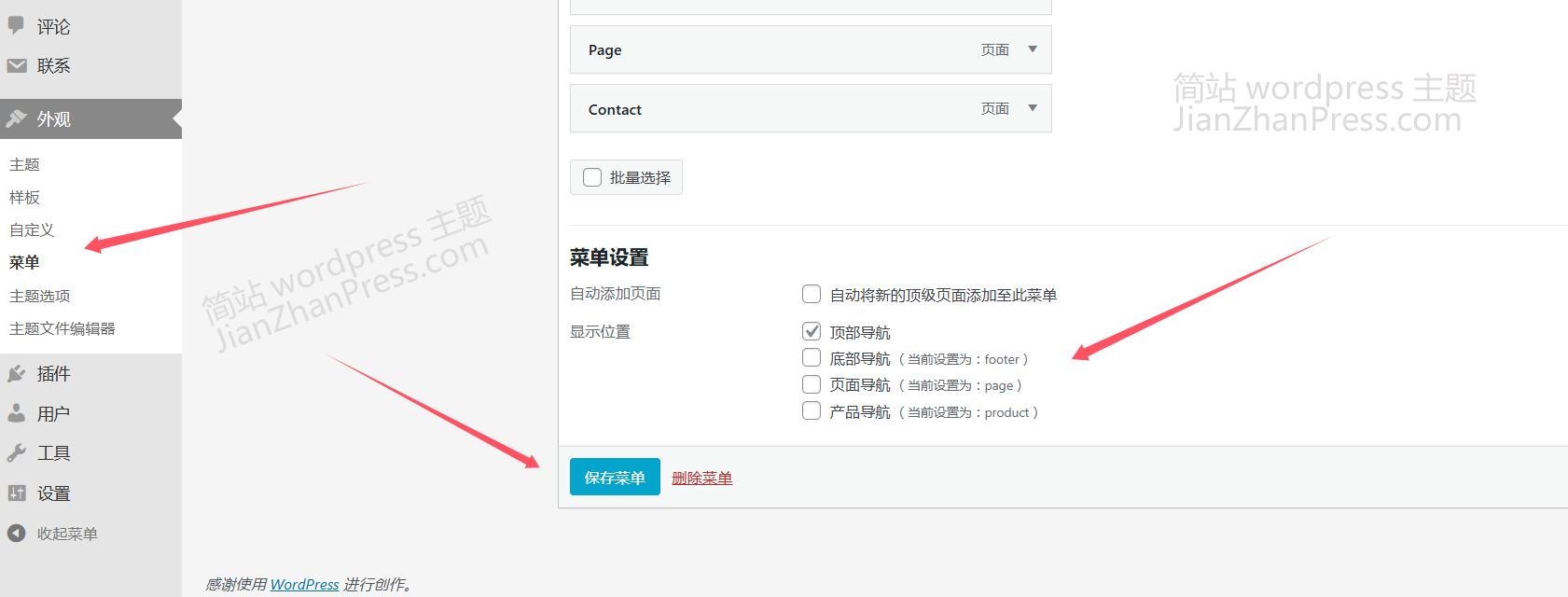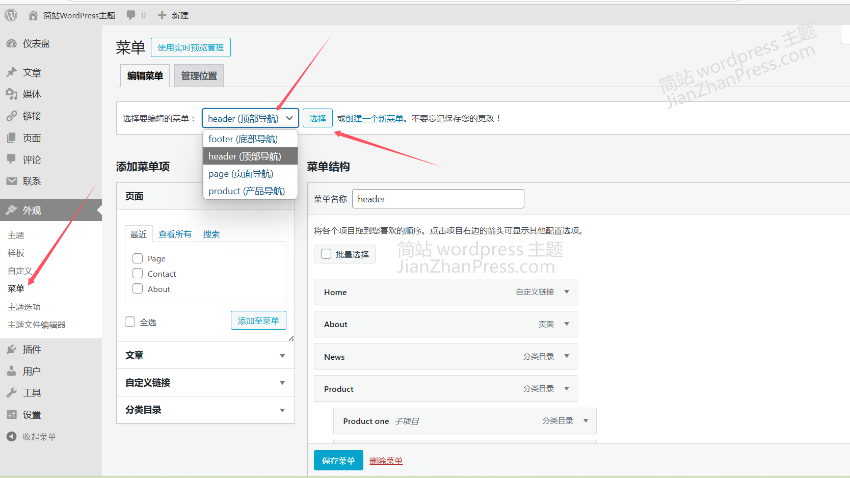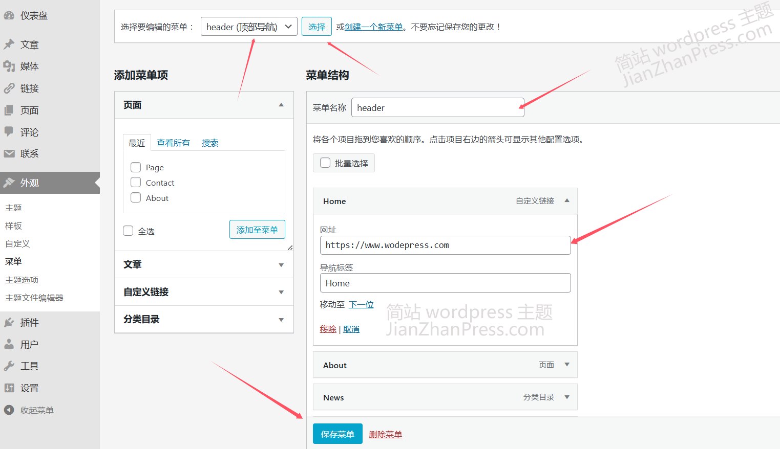 在后台"外观"-"菜单"中可以看到有 4 个菜单,如果需要对各菜单里的项目进行修改,选择相应的菜单编辑,编辑完成保存即可。
